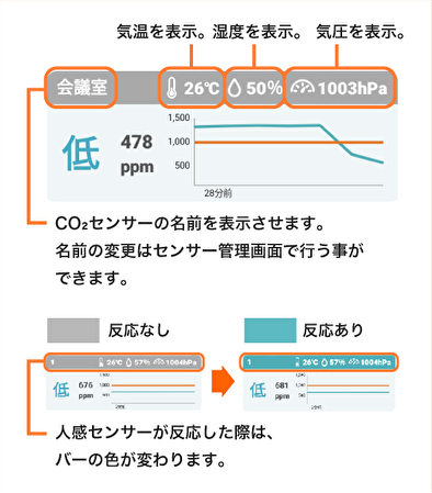 ※CO₂センサーは「日本セラミック社製の複合センサー(SN5-0740-AA01)」です。CO₂濃度、湿度、温度、気圧を、5秒間隔で計測できます。また、人感センサーを搭載しセンサーによる人の在否確認が可能です。給電方法は、USB